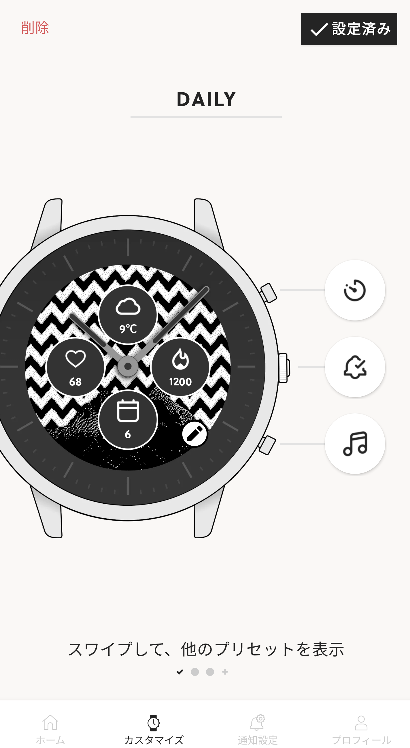 盤面のデザインは専用アプリから変えられる 。この専用アプリ上で歩数、心拍数、睡眠時間、電池の残量など、各種情報が閲覧できて使い勝手もよい。